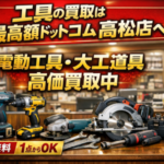 海外にも人気の電動工具の買取は高松買取店へお越しください。ハンドツールなどの工具は需要がありますので高額査定をしております。電動工具の買取には自信があり取引の多くが海外バイヤーさんですので、当店は多くの取引をしておりますので、高額で買取が出来ます。ぜひ1点からでも大量の持ち込みも大歓迎しておりますので、お待ちしております。 最高額ドットコム 高松買取中央店【場所】香川県高松市内町4-1 片原町駅すぐ マルヨシセンター近くフェリー通り沿い 当店ビル1Fに駐車場完備しております。